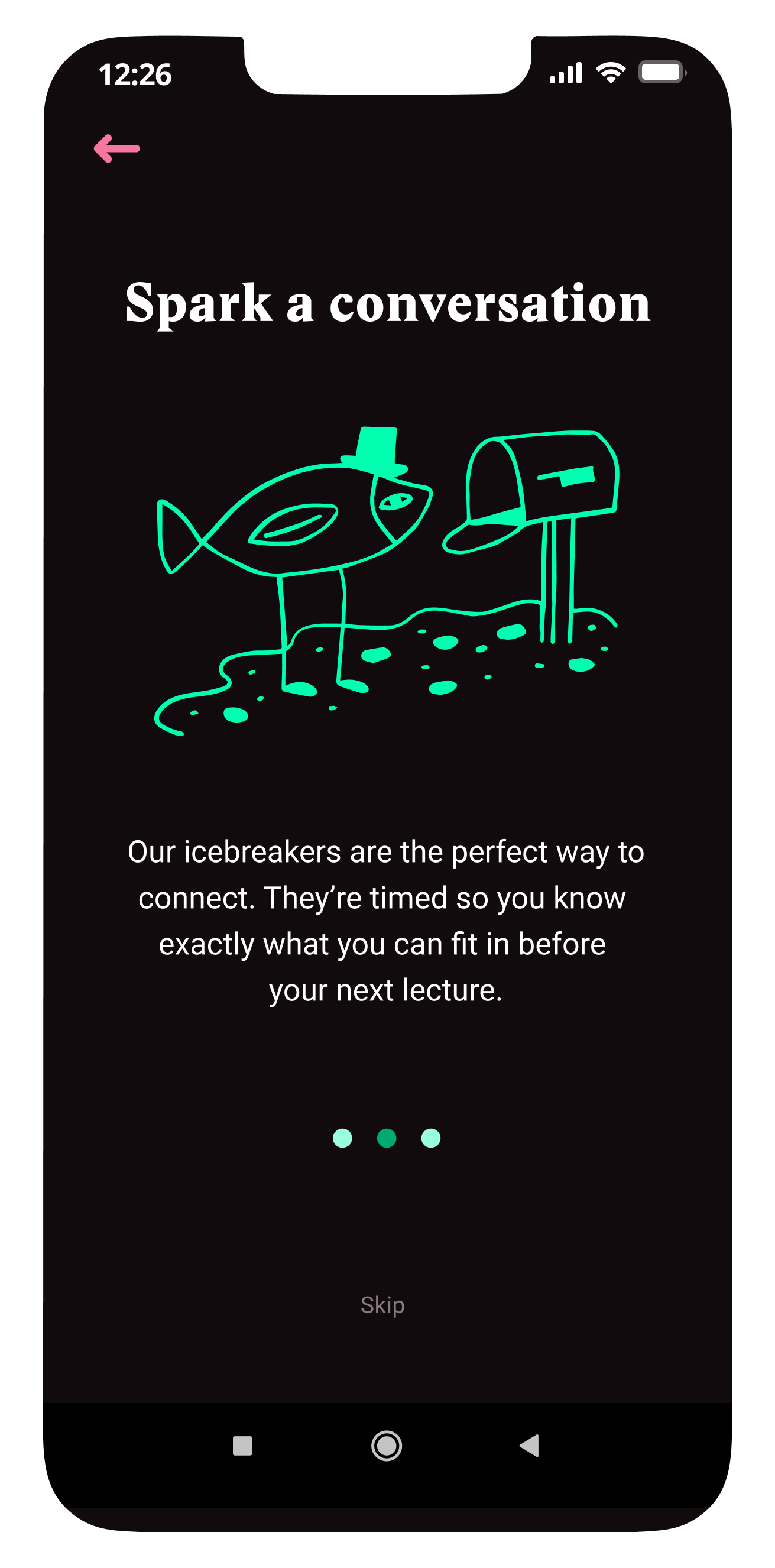 The app is a solution that encourages classmates to connect via icebreakers. These icebreakers are broken down into four sections – depending on the time you have between lectures.